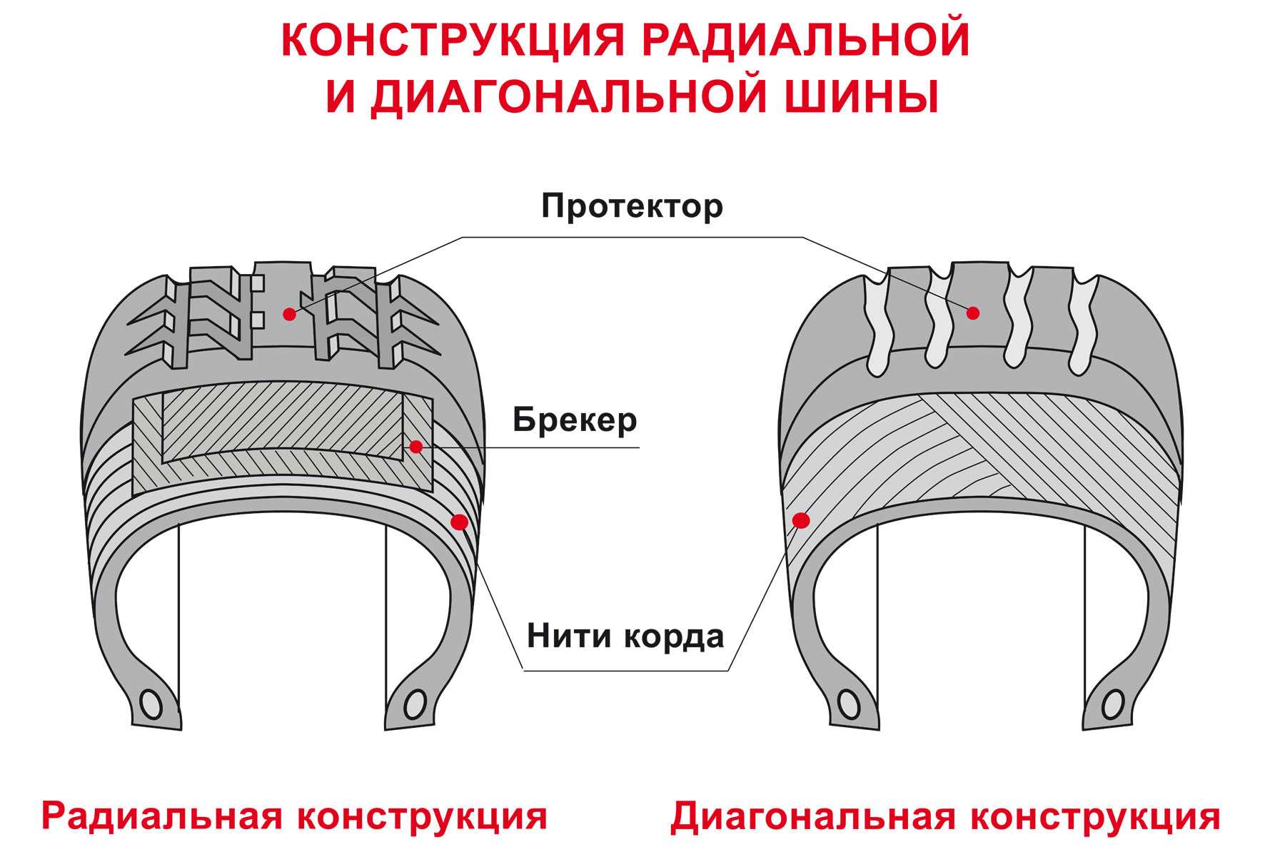 Как уже упоминалось ранее, шины радиальной конструкции маркируют буквой «R» в основном размерном индексе или надписью «Radial», а для диагональных эта буква просто отсутствует. Разница между этими покрышками заключается в расположении нитей корда, которые усиливают жесткость к скручиванию и нагрузкам на шине. В диагональных шинах стальные нити идут переплетаясь под прямым углом, а в радиальных нити равномерно располагаются от края одного борта к другому.