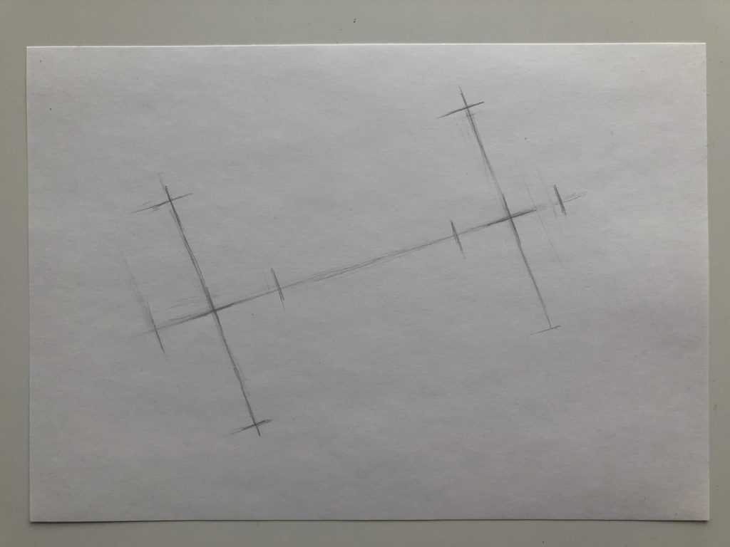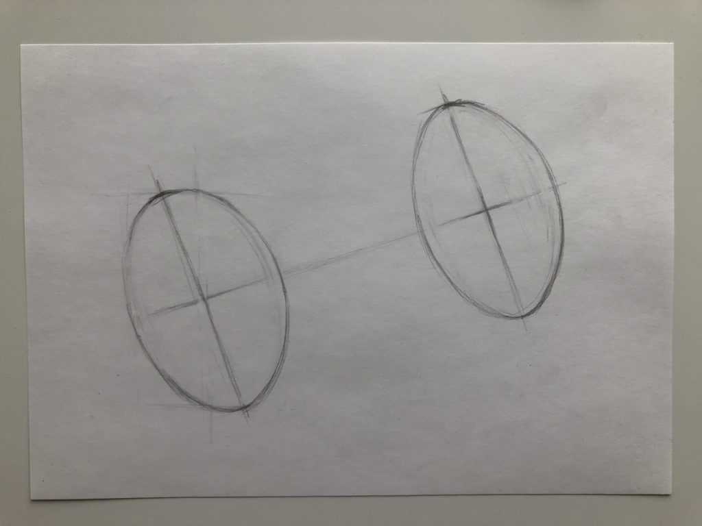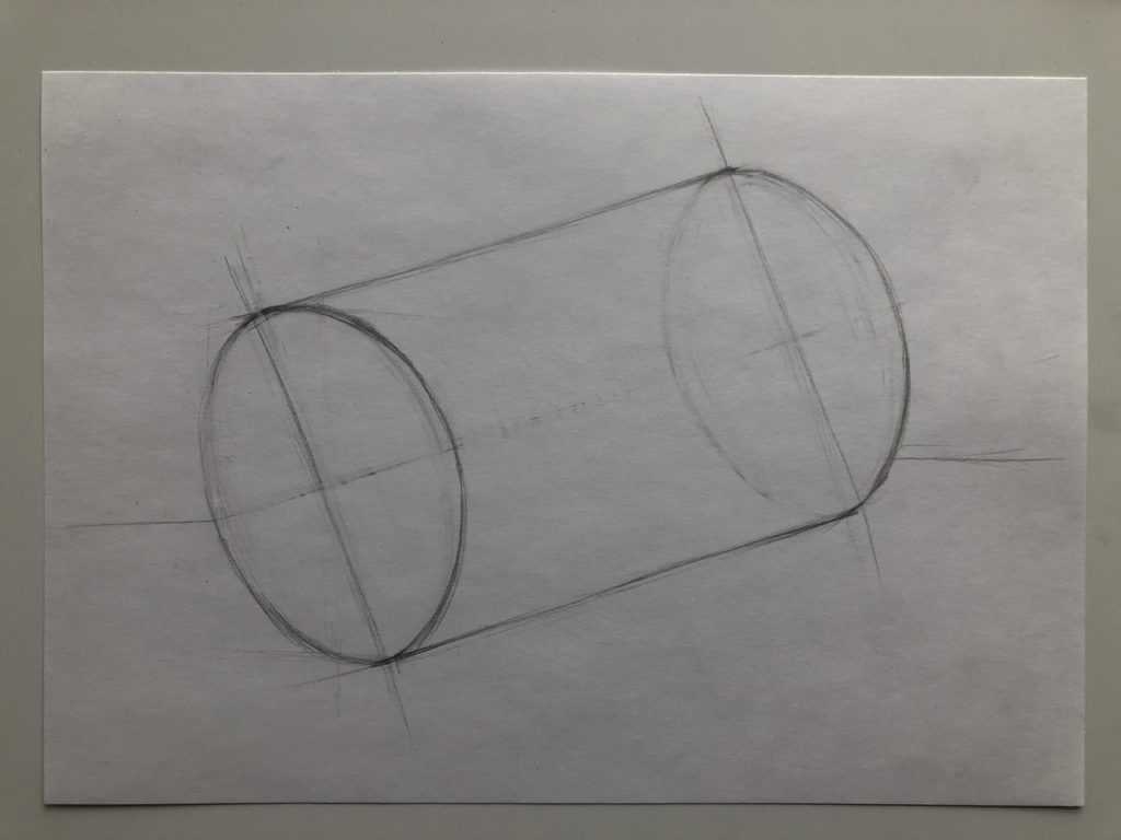 Сначала обозначаем ось симметрии цилиндра, которая будет находиться под наклоном. Далее обозначаем центральную часть эллипсов – переднего и заднего. При рисовании эллипса нужно учитывать, что передний эллипс больше по своему размеру, чем дальний. Так, каждый эллипс мы делим пополам, и немного смещаем эту половинку, для того, чтобы правая часть эллипса была чуть больше, чем левая. Это нужно для того, чтобы передать перспективное сокращение.