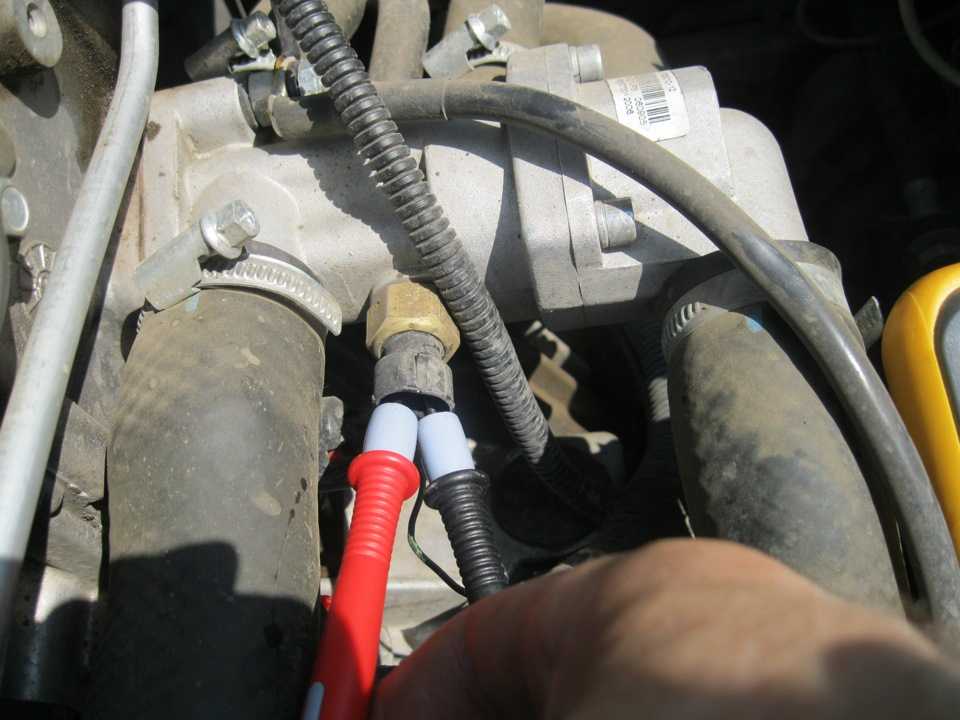 УстановленДатчик температуры охлаждающей жидкости (на фото 2) установлен между головкой блока и термостатом. Датчик температуры охлаждающей жидкости имеет два контакта ( в отличии от одноконтактного датчика температуры для панели приборов, который стоит рядом, не путайте ).