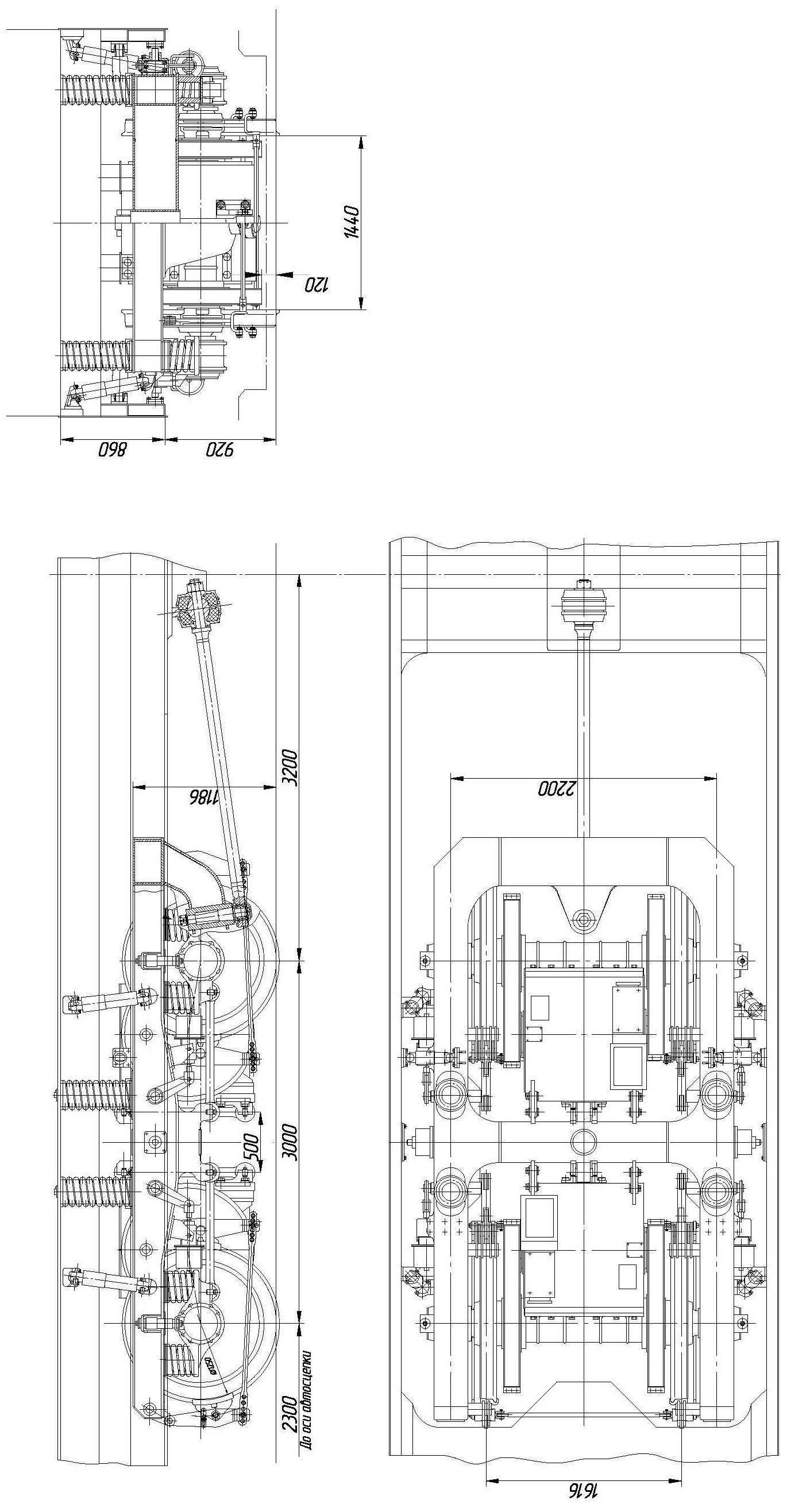 Опорно-осевое подвешивание ТЭД электровоза 2ЭС6 с основными габаритными размерами показано на рисунке 3.2. – ТЭД; 2 – поводок подвески ТЭД; 3 – вал якоря ТЭД; 4 – колесная пара; 5 – рама тележки; 6 – головки поводка с сайлентблоками; 7 – кронштейн для крепления ТЭД к поводку