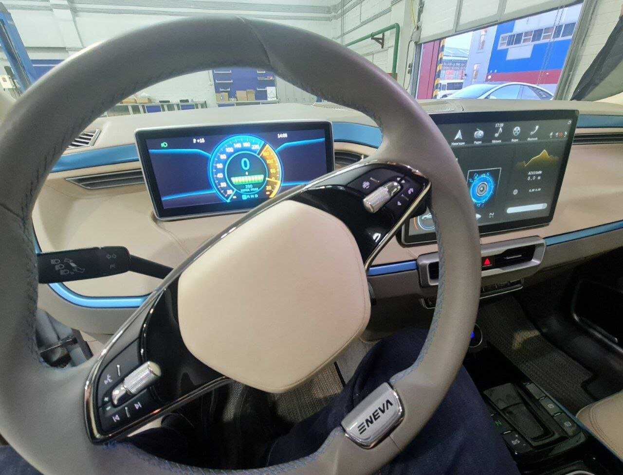 В салоне передняя панель оснащена двумя дисплеями и мультирулем, а надстройка центрального тоннеля оформлена предельно лаконично и несет на себе лишь небольшой блок кнопок. При этом официально подтверждено, что авторы проекта электромобиля E-Neva уже получили патенты на семь промышленных образцов узловых элементов экстерьера и интерьера, т. е. получили защиту интеллектуальных прав на конструкцию центральной консоли, приборной панели, мультифункционального рулевого колеса, оптики, сидений, а также на дизайн и отделку дверных карт.