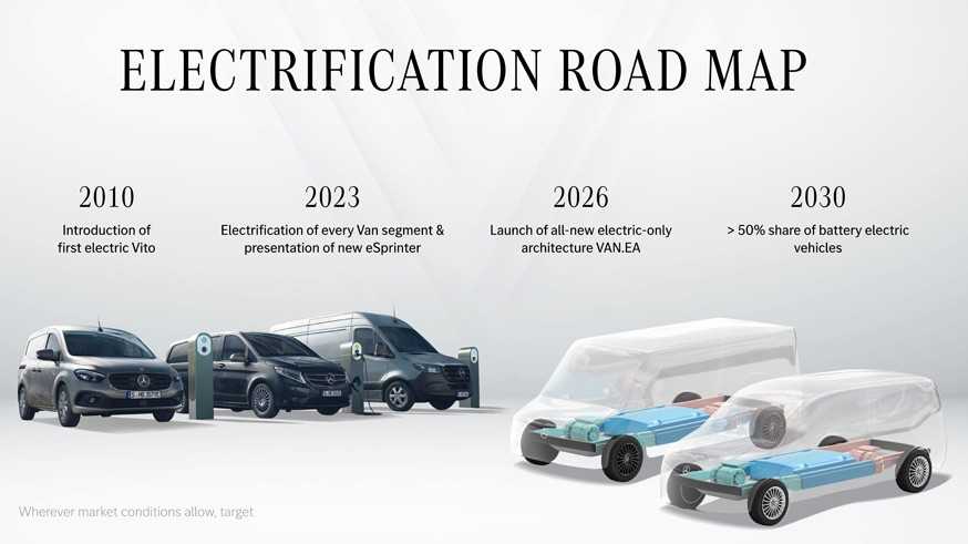 Чтобы удовлетворить различные пожелания и потребности частных и бизнес-клиентов, Mercedes-Benz Vans уже применяет дифференцированный подход. Стратегия, ориентированная на роскошь, которая также действительна для легковых автомобилей компании, будет применяться к фургонам, ориентированным больше на личное использование — EQV, V-Class и V-Class Marco Polo. В то же время легкие грузовики eVito и Vito будут целенаправленно следовать премиальной стратегии. Изменение стратегии будет полностью реализовано с введением в 2026 году недавно анонсированной модульной масштабируемой общей платформы, архитектуры Van Electric или сокращенно VAN.EA. В портфеле как среднеразмерных фургонов — личных автомобилей, так и рабочих автомобилей, в 2030 году электрических моделей должно быть больше половины. Mercedes-Benz Vans добавляет, что на сегодняшний день они продали более 40 000 электрических фургонов, причем eVito является самым продаваемым.