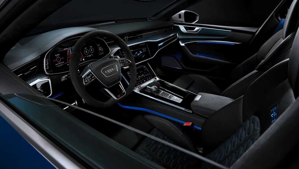 Для отделки интерьера можно выбрать строчку не только серого и красного, но и оттенка Mercato Blue – именно синий цвет в салоне является индикатором наиболее быстрых RS. Также у RS 6 / RS 7 performance синяя метка на руле и синие ремни безопасности, а углепластик, используемый в качестве декоративных вставок, имеет в составе синие нити.