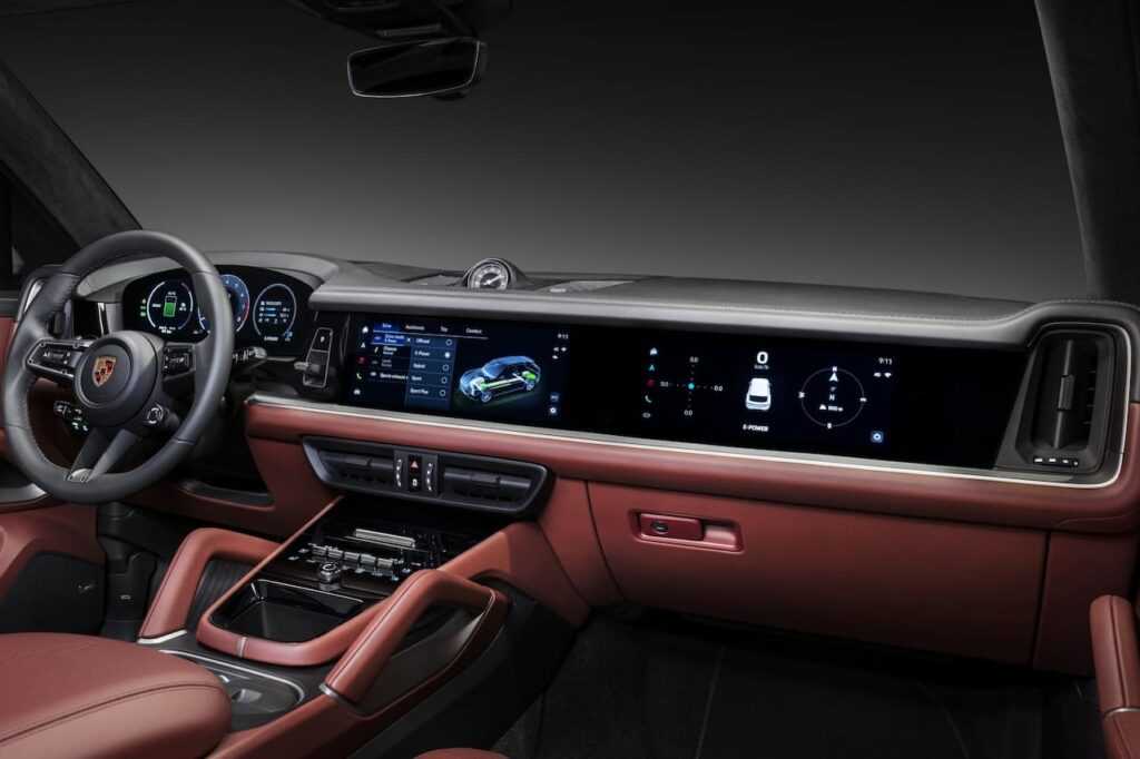 The 2024 Porsche Cayenne features a new dashboard with a passenger display and a new center console without a gearshift lever. Image Source: Porsche