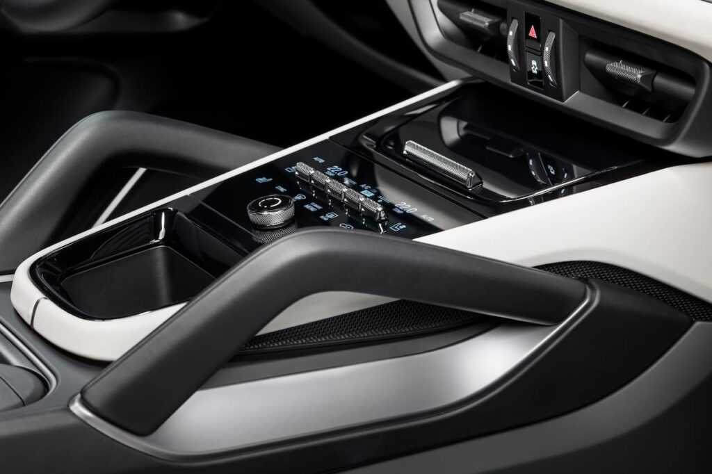Центральный тоннель полностью новый: селектор «автомата» теперь расположен справа от щитка приборов (еще одно «электромобильное» решение), благодаря чему удалось высвободить место под дополнительный отсек для мелкой поклажи и новый блок управления «климатом». Однако, в отличие от «Тайкана», у обновленного кроссовера он не полностью сенсорный и имеет пять тумблеров.