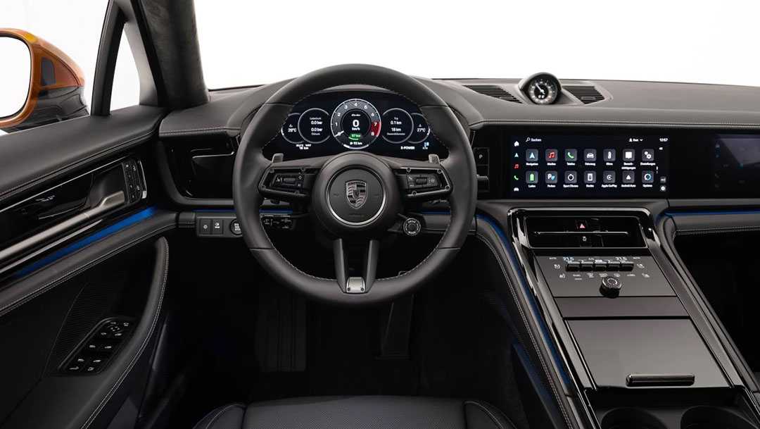 В модернизированном кокпите Porsche Panamera 2024 года появился полностью цифровой изогнутый приборный дисплей с тремя большими круглыми циферблатами.