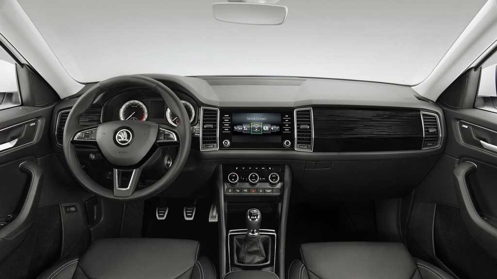 Интерьер нового Kodiak отличают хорошее качество отделочных материалов, продуманная эргономика и масса привычных для Шкод «умных» решений. Передняя панель оформлена в строгом стиле, исключающем лишние клавиши и переключатели. Мультимедийная система и та управляется только сенсорами (физические кнопки предусмотрены только для начальной магнитолы Swing).