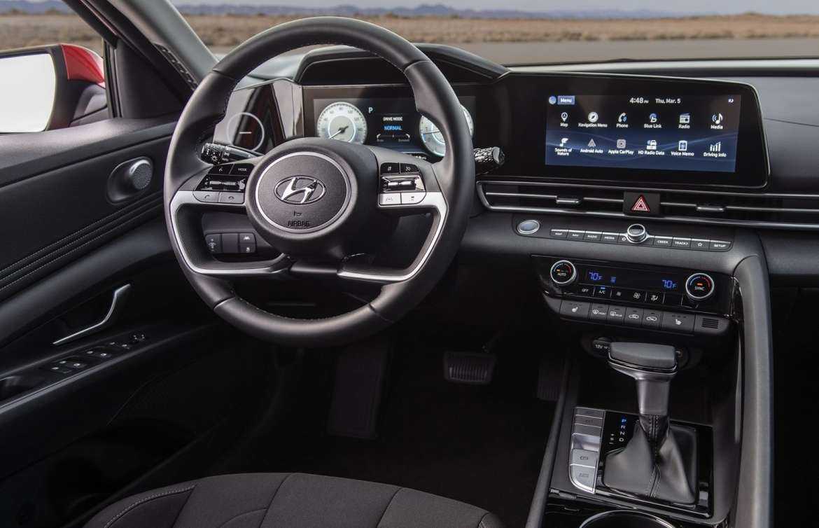 Интерьер Hyundai Elantra 2021 модельного года оформлен в новом фирменном стиле, заданном, в частности, моделями Hyundai, Kia и Genesis гораздо более высокого класса. В частности, автомобиль получит стильный 4-спицевый руль, а также объединенные под одним стеклом два 10,25-дюймовых дисплея, один из которых управляет мультимедийной системой, а второй представляет собой полностью цифровую приборную панель. Последний прикрыт традиционным «козырьком», призванным предохранять экран от солнечных бликов и засветки.