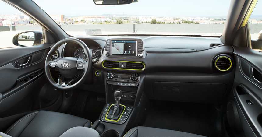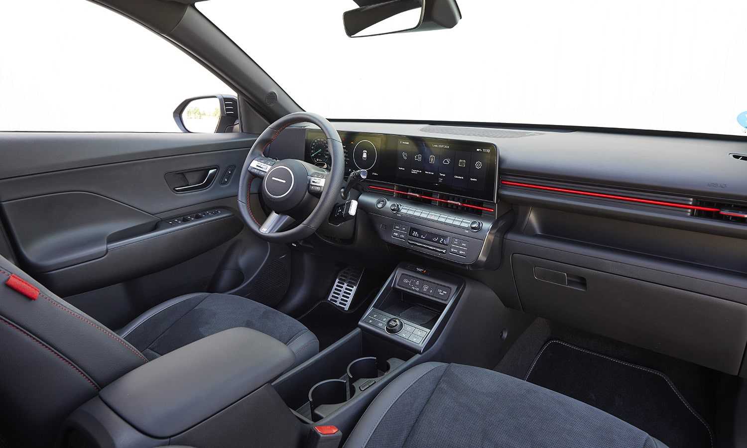 Внутри последняя версия Kona представляет собой полный комплект интерьера, достойный электронной новинки премиум-класса. На комбинации приборов находится 12,3-дюймовая цифровая панель. Есть дополнительная 12,3-дюймовая цифровая консоль.