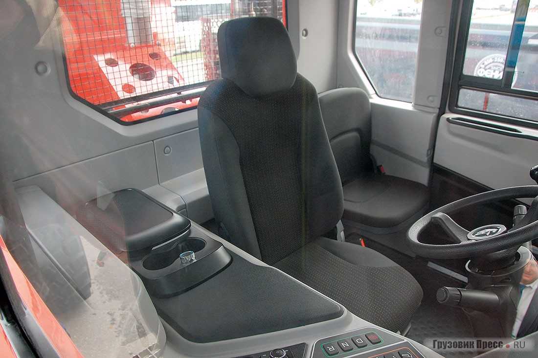 Особое внимание уделено кабине водителя. Бортовой компьютер, монитор, несколько кнопок для переключения режимов движения и для разгрузки