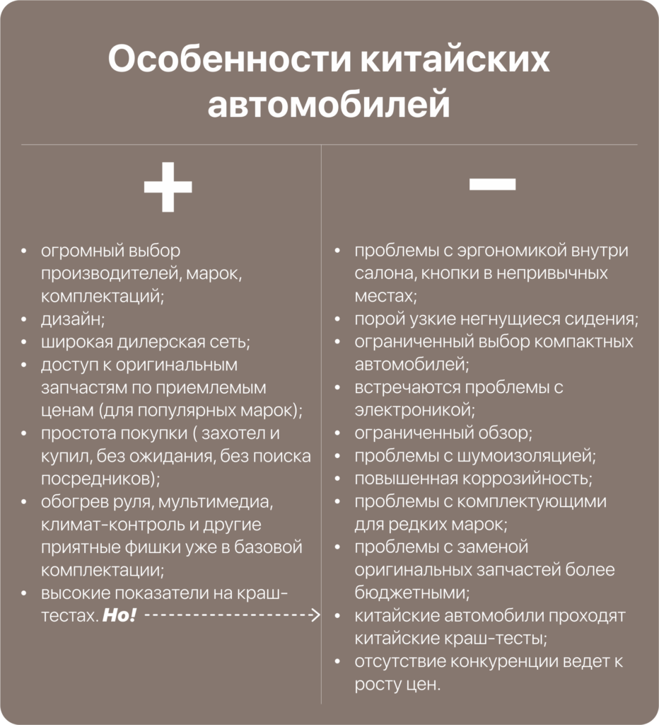 Китайские автомобили на краш-тестах получают отличные оценки, проблема в том, что краш-тесты тоже китайские. Но все автоэксперты признают: качество автомобилей выросло, это совсем не то, что было 10 лет назад. Правда, случаются единичные сбои, попадаются авто с глюками в электронике, но покупка автомобиля на гарантии проблемы снимает.