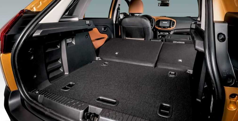 Более того есть поддержка органайзера, телефонии, информационного блока опций машины и крупная ручка с климат-контролем. Еще, в новом российском кроссовере удивляет тщательно продуманная эргономика и качество деталей интерьера, какой обладает взрослым, благородным и в то же время современным обликом. Впереди, были установлены красивые сидения с неразвитой боковой поддержкой, однако с большим количеством диапазоном настроек. Багажное отделение располагает собой 376-ю литрами свободного пространства, какое при необходимости можно увеличить, если сложить задний диван до 1382-х литров. На дне располагается полноразмерное запасное колесо, диаметром 15 дюймов. Примечательно то, что сам автомобиль комплектуется 16-ти дюймовыми дисками колес.