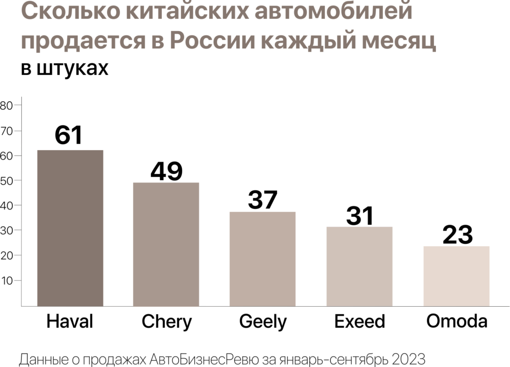 Популярность китайских автомобилей резко пошла вверх c середины 2022 года. Теперь это самые доступные иномарки — и в том, что касается цены, и в том, что касается наличия/простоты покупки. Экспансия китайского автопрома очевидна: наращиваются поставки комплектующих, работают дилерские центры. К началу октября-2023 в России насчитывается 1926 китайских салонов, 9 из 10 открытых в 2023-м шоу-румов — китайские.