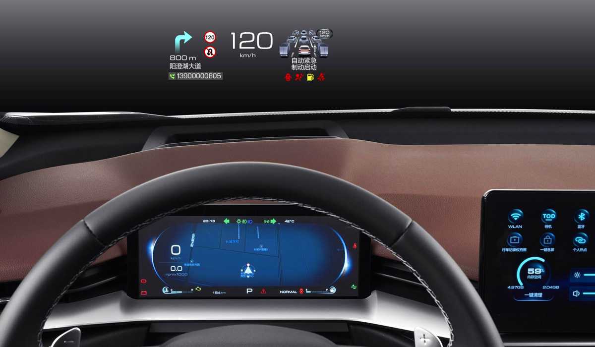 12,3-дюймовые дисплеи для мультимедиа системы и приборной панели плюс такой же широкий 10-дюймовый проекционный экран с симпатичной графикой создают приятное оформление кокпита, а черная лакированная отделка центрального тоннеля с серебристой шайбой управления трансмиссией и светлой кожей подлокотника выглядят дорого и презентабельно.