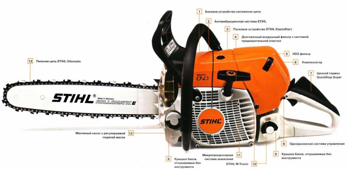 Бензиновая пила имеет автоматическую систему смазки цепи. Шина подает масло, которое потом впитывают опилки. Если пила работает на холостом ходу, то подача масла прекращается.