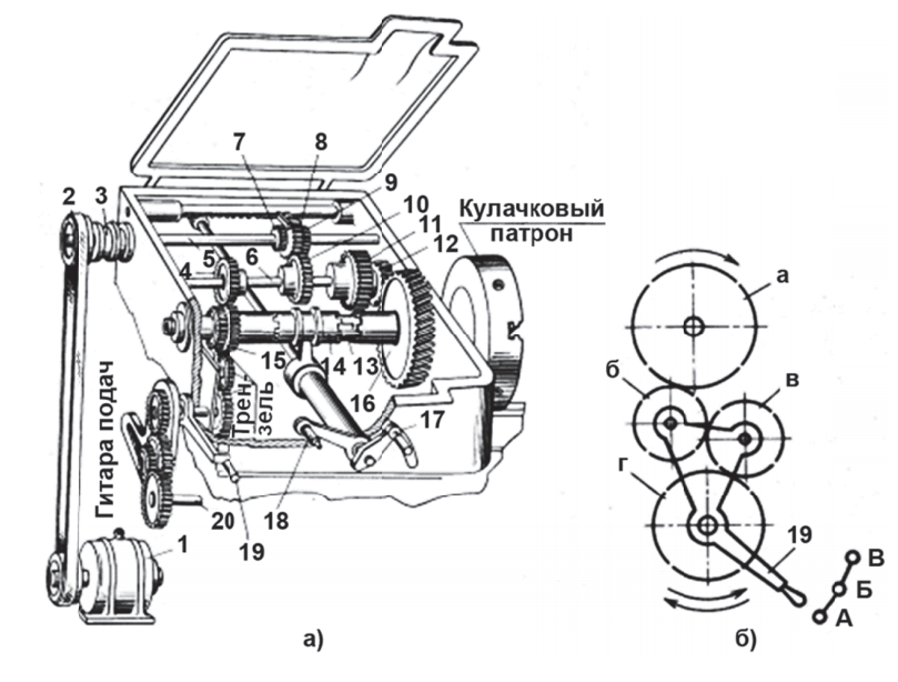 С помощью гитары устанавливают (настраивают) сменные зубчатые колеса с определенным передаточным отношением, которым задают частоту вращения валу 20 для обеспечения необходимого перемещения суппорта на один оборот шпинделя.