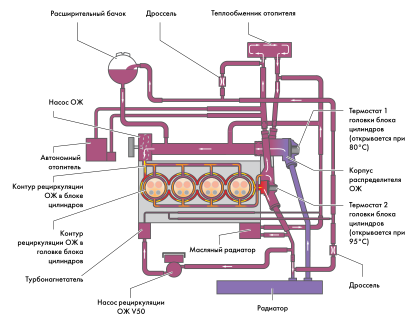 Турбонагнетатель работает на основе энергии отработавших газов, выдавая высокий КПД, но требует серьезного подхода к охлаждению, т.к. создает высокую температуру (зеленый диапазон 3).