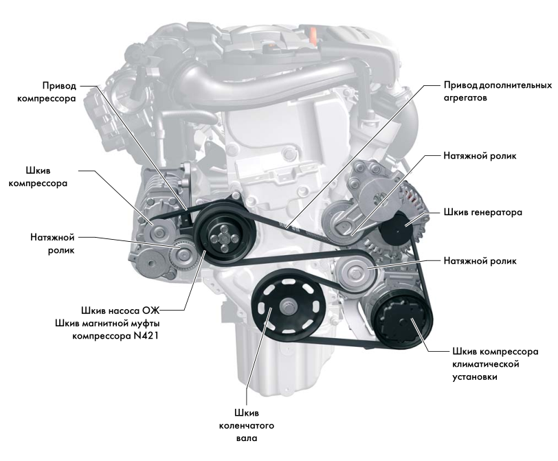 В конструкции предусмотрено два ремня: один предназначен для насоса охлаждающей жидкости, генератора и работы климатической установки, второй отвечает за компрессор.