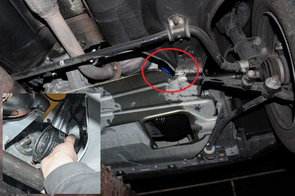 - Залезьте под днище машины и найдите пробку сливного отверстия на картере трансмиссии, оцените ее состояние. Если место вокруг крышки грязное, то очистите его тряпкой от загрязнений. Это позволит предотвратить их попадание в смазочную систему КПП автомобиля.