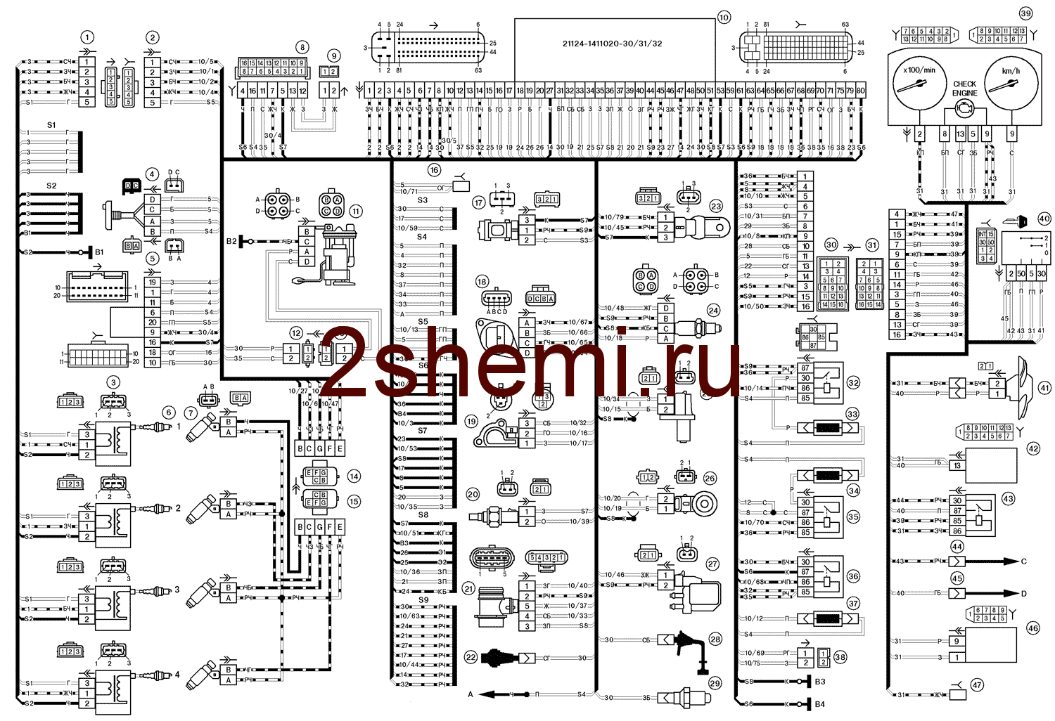 1 – колодка жгута проводов катушек зажигания к жгуту системы зажигания; 2 – колодка жгута системы зажигания к жгуту проводов катушек зажигания; 3 – катушки зажигания ВАЗ-21104; 4 – датчик сигнализатор иммобилизатора; 5 – блок управления иммобилизатора; 6 – свечи зажигания; 7 – форсунки; 8 – колодка диагностики; 9 – колодка жгута системы зажигания к жгуту салонной группы АБС; 10 – контроллер; 11 – электробензонасос; 12 – колодка жгута системы зажигания к жгуту датчика уровня топлива; 13 – колодка жгута датчика уровня топлива к жгуту системы зажигания; 14 – колодка жгута системы зажигания к жгуту форсунок; 15 – колодка жгута форсунок к жгуту системы зажигания; 16 – колодка жгута системы зажигания к жгуту боковых дверей; 17 – датчик скорости; 18 – регулятор холостого хода; 19 – датчик положения дроссельной заслонки; 20 – датчик температуры охлаждающей жидкости; 21 – датчик массового расхода воздуха; 22 – датчик контрольной лампы давления масла; 23 – датчик фаз; 24 – датчик кислорода; 25 – датчик положения коленчатого вала; 26 – датчик детонации; 27 – электромагнитный клапан продувки адсорбера; 28 – датчик уровня масла; 29 – датчик указателя температуры охлаждающей жидкости; 30 – колодка жгута системы зажигания к жгуту панели приборов; 31 – колодка жгута панели приборов к жгуту системы зажигания; 32 – реле зажигания; 33 – предохранитель реле зажигания; 34 – предохранитель цепи питания электробензонасоса; 35 – реле электробензонасоса; 36 – реле электровентилятора; 37 – предохранитель цепи питания контроллера; 38 – колодка жгута системы зажигания к соединителю кондиционера; 39 – комбинация приборов; 40 – выключатель зажигания; 41 – электровентилятор системы охлаждения; 42 – блок бортовой системы контроля; 43 – реле стартера; 44 – контакты 8-клеммных колодок жгута панели приборов и жгута переднего; 45 – контакты 21-клеммных колодок жгута панели приборов и жгута заднего; 46 – маршрутный компьютер; 47 – диагностический разъем.