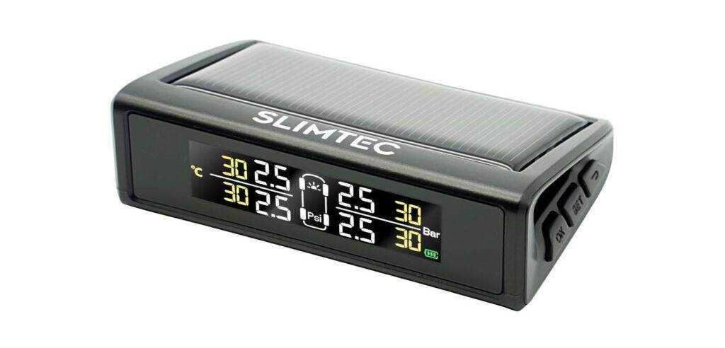 Основной блок, обрабатывающий информацию, имеет большой информативный цветной дисплей. Питание устройства осуществляется от встроенного аккумулятора и солнечной батареи. Оборудование контролирует давление и температуру в шинах в режиме реального времени, сообщает о напряжении в сети и предупреждает о низком уровне заряда батареи. Среди основных функций — предупреждения о низком давлении в колесах, быстрой утечке воздуха, потере сигнала от контроллеров.