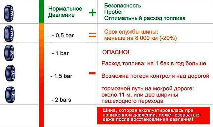 Ресурсность недокачанных покрышек резко снижается. Ведь площадь деформации слишком большая, а протектор пробуксовывает по дорожному полотну. В результате резина нагревается, внутреннее трение увеличивается. Когда автовладелец не знает, какое давление в шинах автомобиля должно быть, и колеса недокачаны, возникает множество проблем.