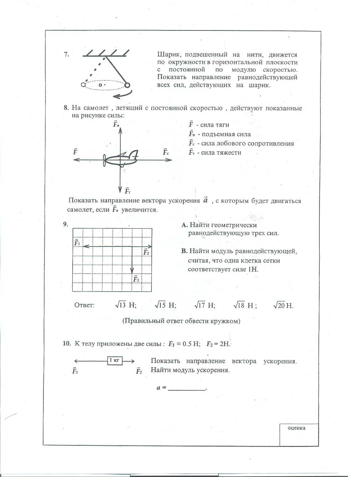 Шарик, подвешенный на нити, движется по окружности в горизонтальной плоскости с постоянной по модулю скоростью. Покажите на рисунке направление равнодействующей всех сил, действующих на шарик