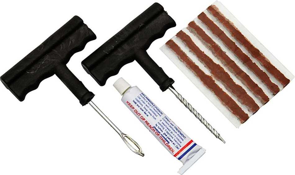 Такой набор включает в себя два инструмента: сверло и петлю. До начала ремонта необходимо пройтись ручным сверлом по отверстию, расширив его, затем вставить жгут в петлю и обмазать клеем предварительно обезжиренное отверстие. Следующий этап ремонта самый ответственный: резким движением просовываем жгут, закрепленный в петле, в отверстие и выдергиваем обратно. Затем необходимо обрезать остатки, подождать, пока высохнет клей, и накачать колесо. Все! Можно ехать!