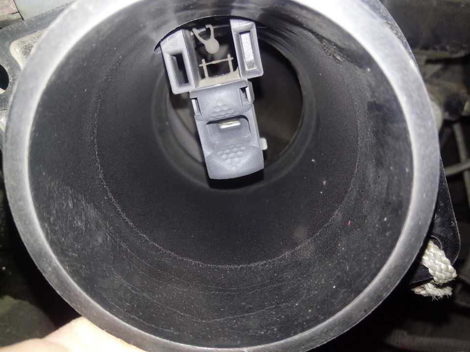 - Осматриваем визуальным методом. С помощью отвертки демонтируем хомут и гофрированный патрубок системы подачи воздуха в коллектор. Снимаем сам датчик и смотрим на его внешнее состояние. Исключено присутствие следов влаги и царапин. Если датчик воздуха покрыт пленкой масла, то подозреваем мотор на предмет износа его элементов или системы вентиляции картера.