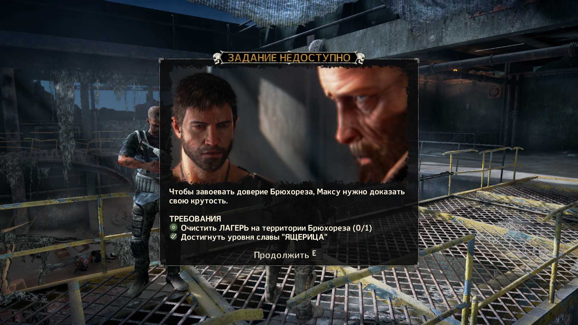 Для того чтобы следующее задание было доступно, нужно выполнить ряд условий, которые описаны ниже в скриншоте. Очистить лагерь на территории Брюхореза, и достигнуть уровня славы «Ящерица». После того как все условия выполнены, можете приступать к выполнению задания, которое поручает вам Брюхорез.