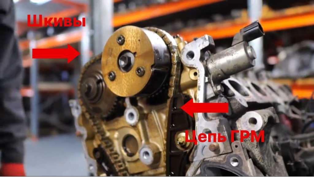 Привод ГРМ приводится в движение пластинчатой цепью Морзе. Со временем она растягивается, но это нормальная ситуация. Такая ситуация наступает не ранее, чем через 200 тыс. км пробега. Но с заменой лучше не затягивать, потому что растянутая цепь сильно изнашивает зубья шкивов неотделимых от фазовращателей, замена которых обойдется по 250 долларов за один. Наличие стопора противохода цепи ГРМ позволяет без опасения оставлять автомобиль, оснащенный данным двигателем на скорости при стоянке.