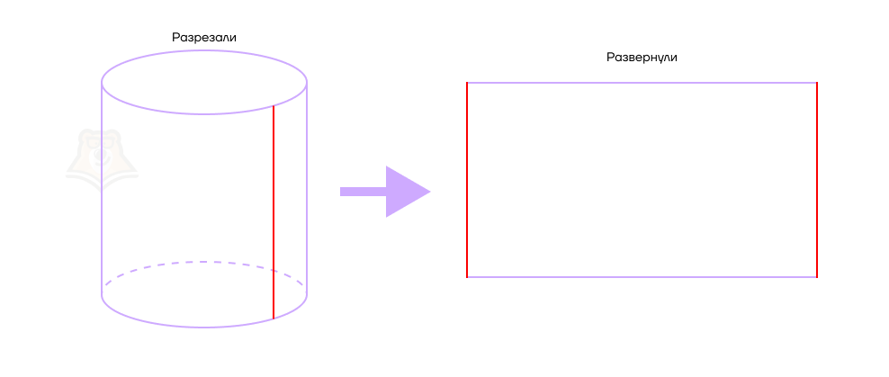 Если мы разрежем поверхность цилиндра по одной из его образующих и как бы “развернем” ее, у нас получится прямоугольник.