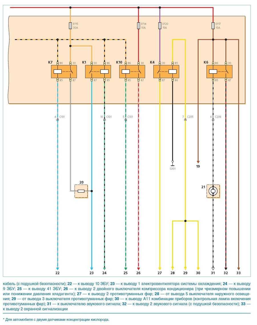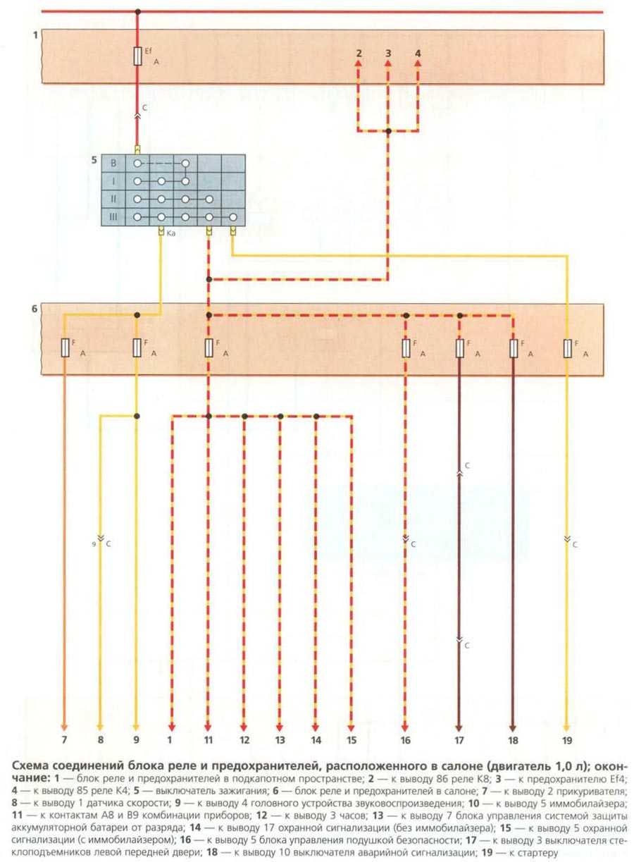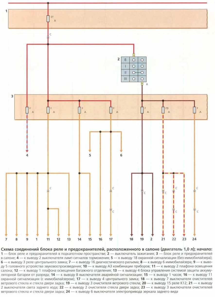 - Схема соединений блока реле и предохранителей, расположенных в салоне
