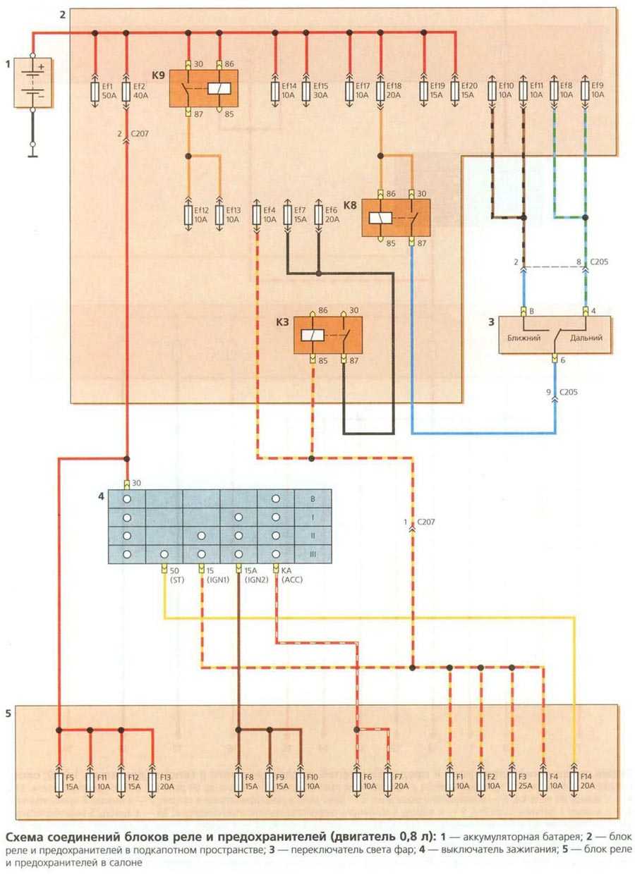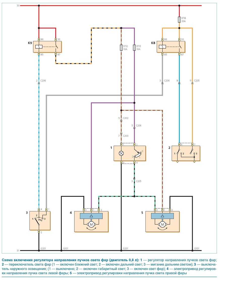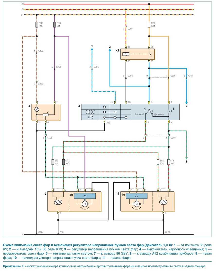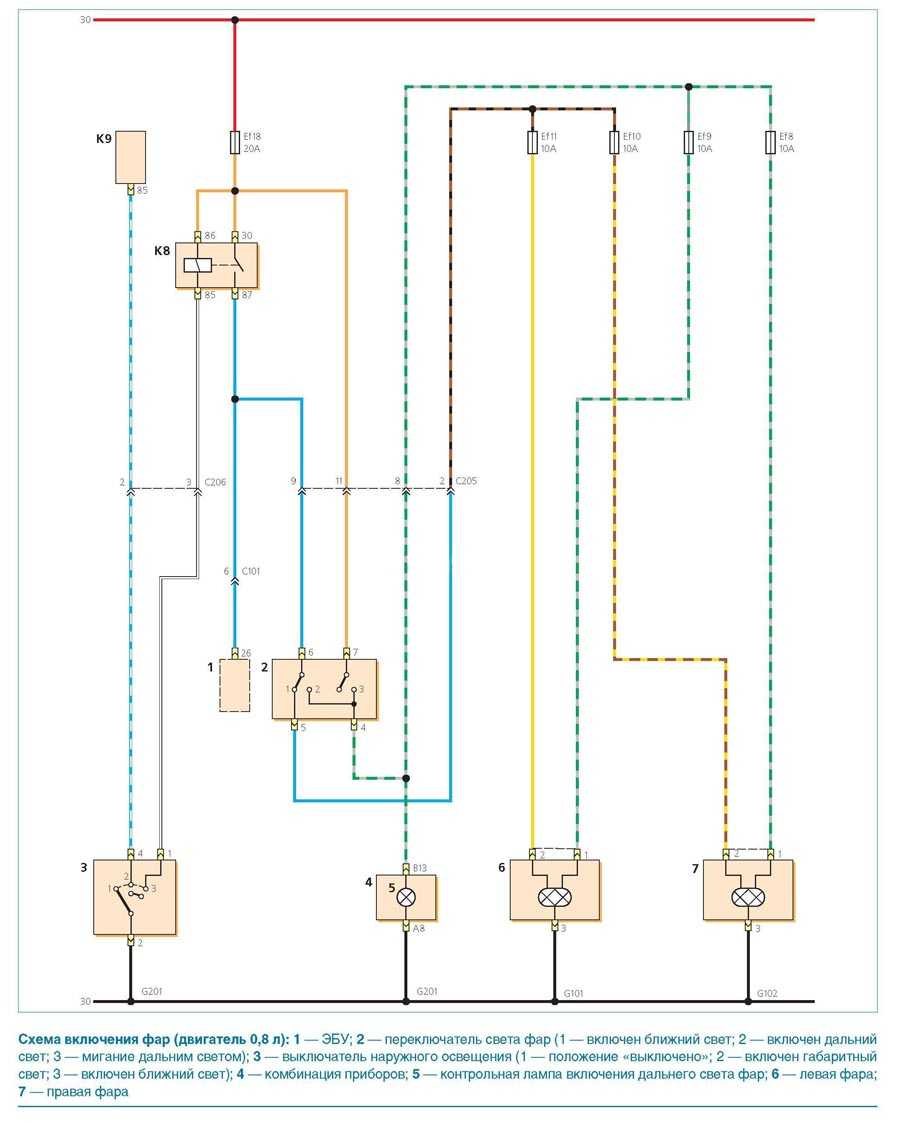 Схема включения фар (двигатель 0,8л)