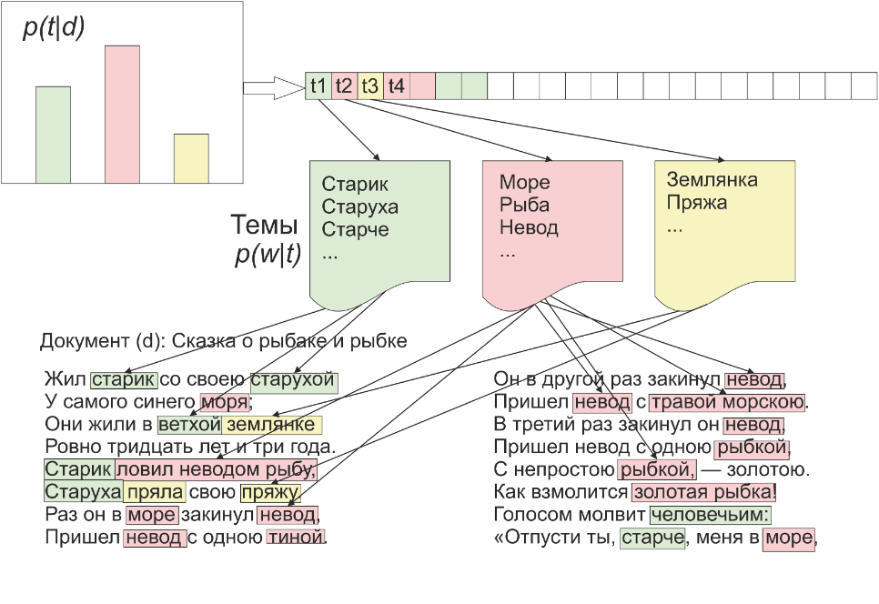 В качестве примера можно посмотреть на распределение тем в сказке «О рыбаке и рыбке». Заметно, что тематическая модель выделяет такие тематика как: морская, бытовая и о старике и старухе. При этом каждая тематика описывается специфичной для неё лексикой.