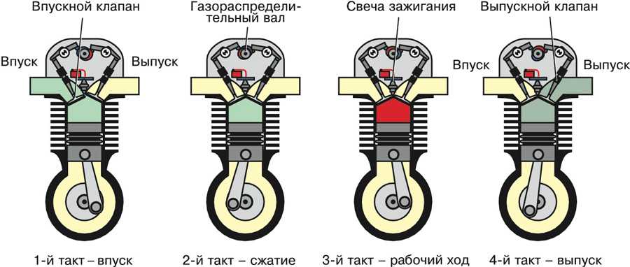 Эти этапы принято называть тактами работы ДВС, отсюда же пошёл и термин 4-тактный двигатель.