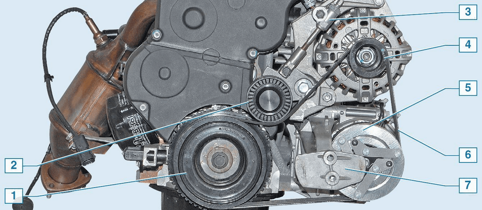 Шкив двигателя, закреплённый на валу, передаёт усилие одному или нескольким другим шкивам. Всё зависит от комплектации – в ней могут присутствовать ГУР с кондиционером (рис. 1) либо только ГУР (рис. 2). В варианте без ГУРа ремень передаёт усилие на генератор.