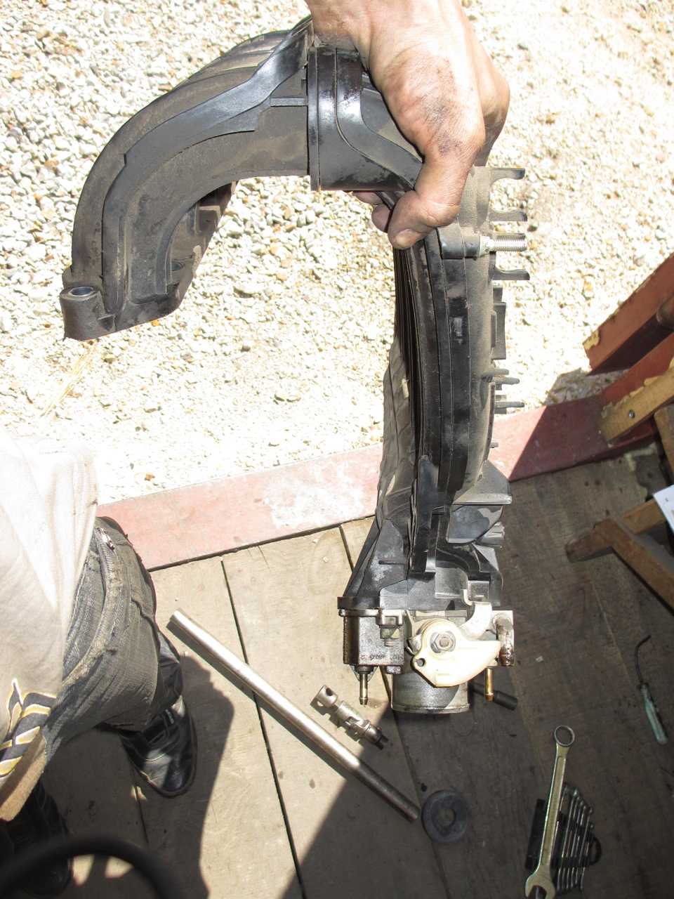 - в первую очередь нужно демонтировать дроссель. Нет, необходимости полностью его снимать, просто отведите узел, соединяющий его с коллектором, вбок. Также надо снять заслонку дросселя, чтобы все тщательно почистить;