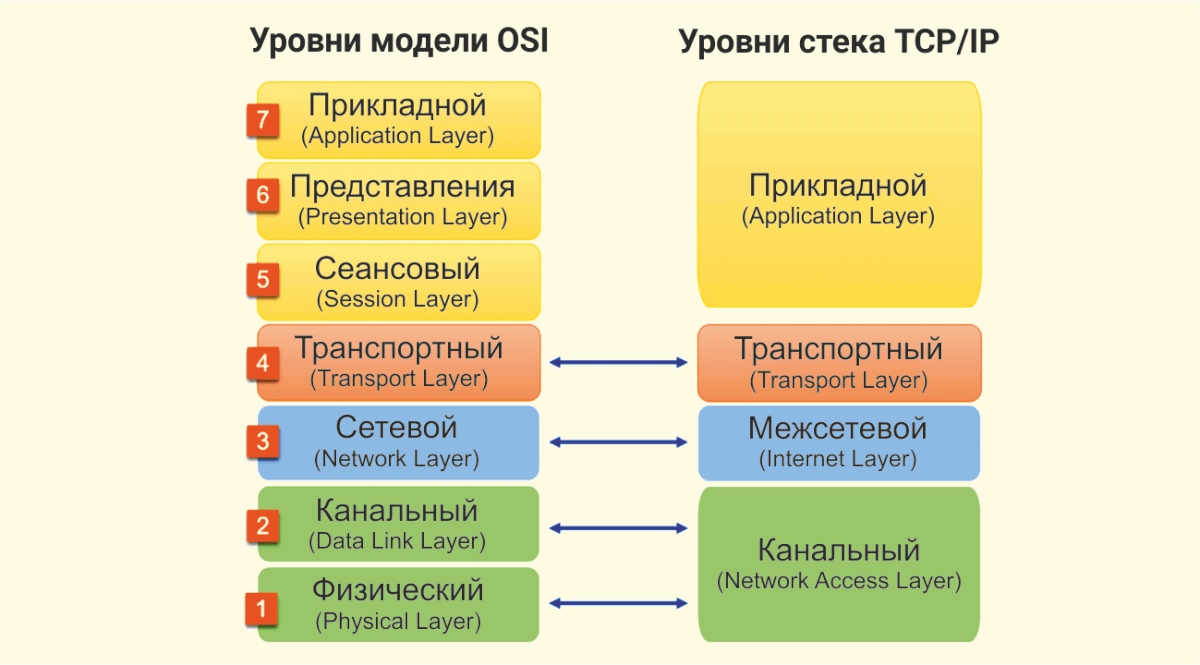 Главное различие между моделями TCP/IP и OSI заключается в количестве уровней. OSI включает семь уровней, тогда как TCP/IP объединяет уровни 5-7 OSI в один прикладной уровень, а уровни 1-2 OSI в уровень сетевого интерфейса.