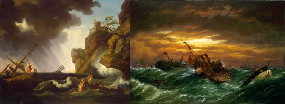 Слева: Клод Верне (Франция). Кораблекрушение. 1763 г. Государственный Эрмитаж, Санкт-Петербург. Справа: Ричард Нибс (Англия). Кораблекрушение. 19 век. Национальный морской музей, Лондон