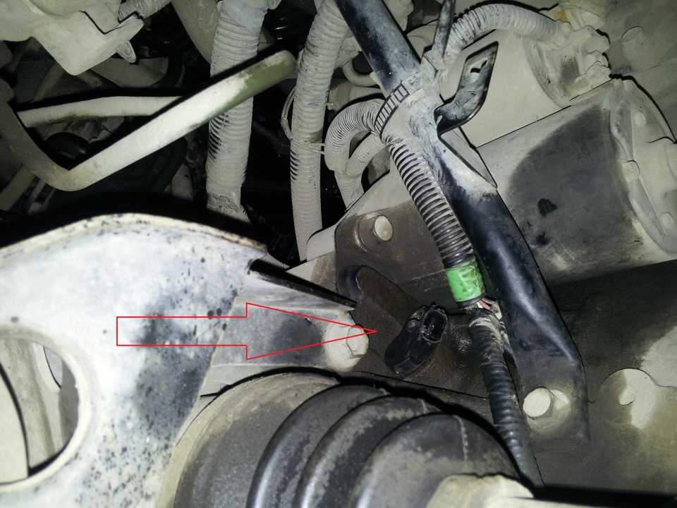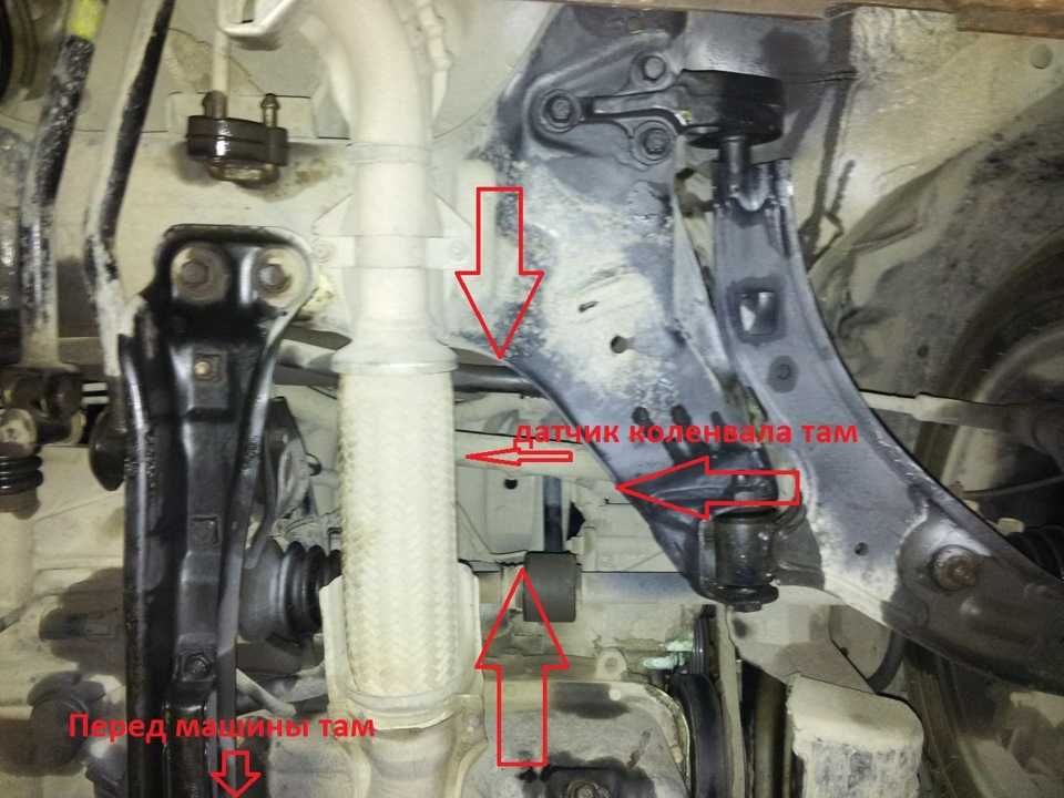 Где установлен датчик коленвала нашел не сразу, почитал много в инете, полазил под капотом и все таки нашел.Снимать его лучше из под машины, я делал это в гараже из ямы. В сети пишут, что меняли и сверху, но мне кажется это не реально, длины и гибкости моих рук не хватило, разборка воздуховодов и воздушного фильтра тоже пользы не принесла.