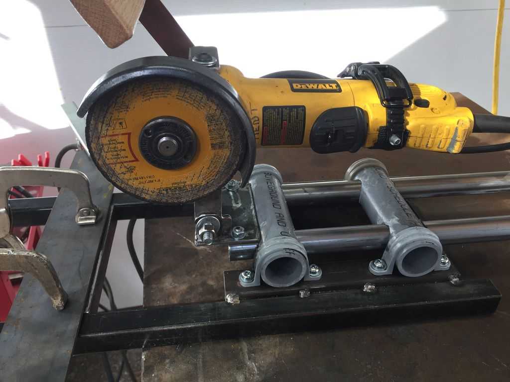 - Болгарку фиксируют к консоли при помощи стальных хомутов. Ручка болгарки будет служить элементом управления.