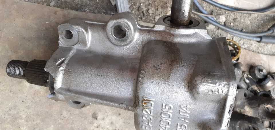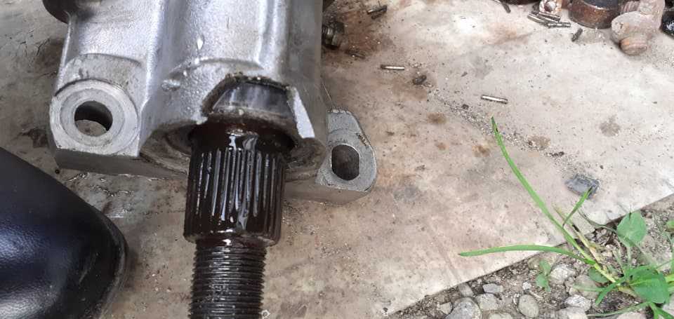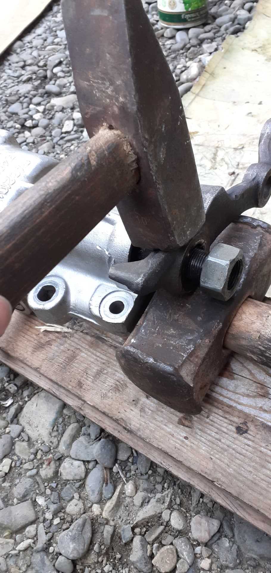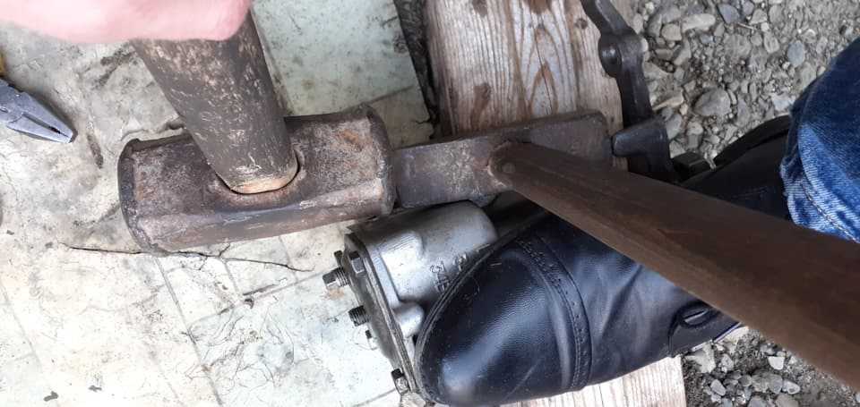 А потом на сошки надеваем квадратную трубку, надеваем редуктор и откручиваем гайку головкой ‘30’. После этого рулевой механизм плотно оборачиваем тряпкой, чтобы не задеть его молотком, кладем на ровную поверхность, плотно прижимаем ногой, ставим молоток на «выступ» сошки и ударяем это через молоток с кувалдой. И так по очереди, сначала один «выступ», потом другой. Затяните гайку на валу сошки так, чтобы не повредить резьбу. Таким образом мне удалось снять сошки без нагрева и выдергивания. Фотографии прилагаются