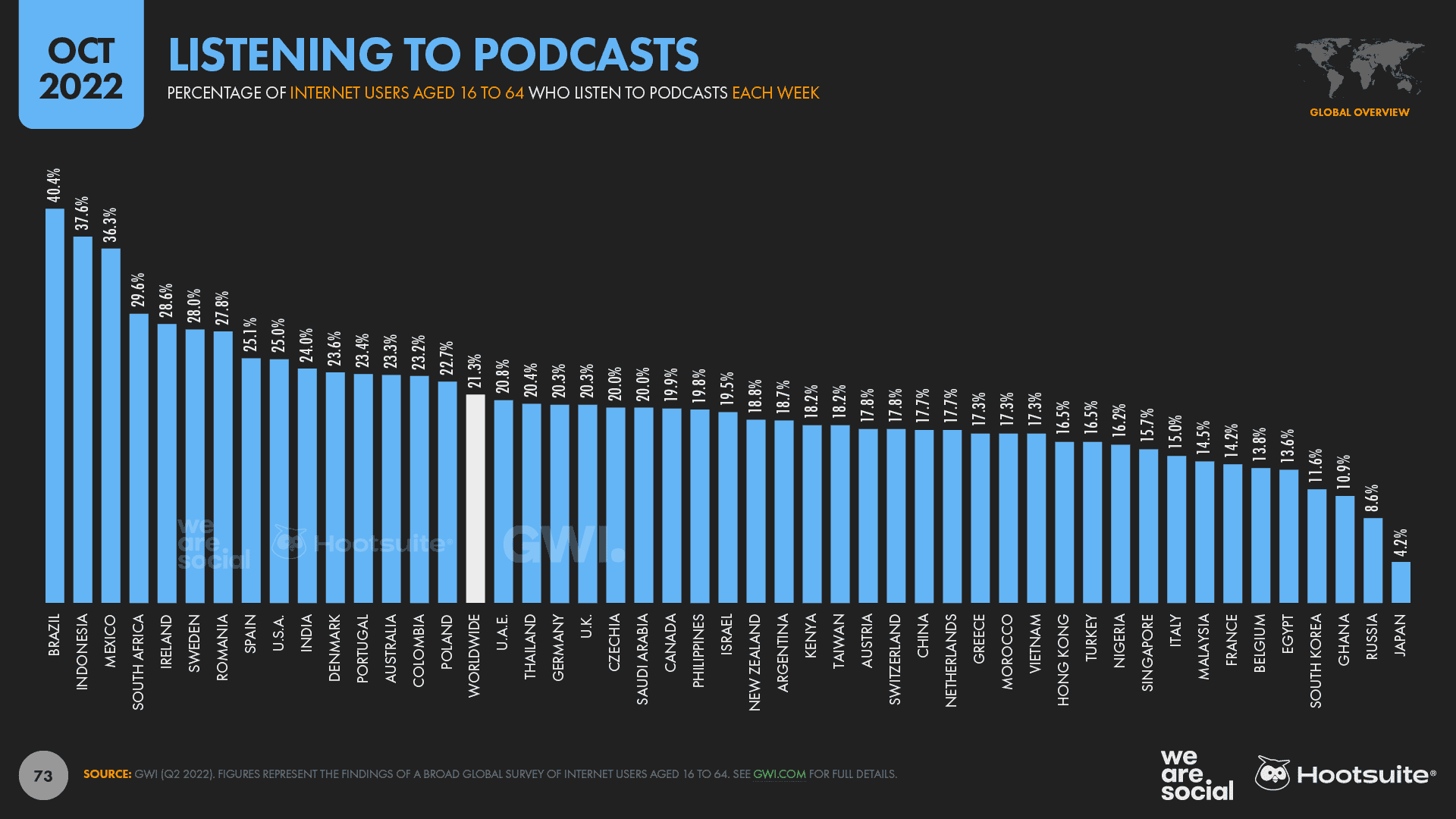 Brazilians are the biggest consumers of podcast content, with more than 4 in 10 working-age internet users in the country saying that they listen to at least one podcast each week.