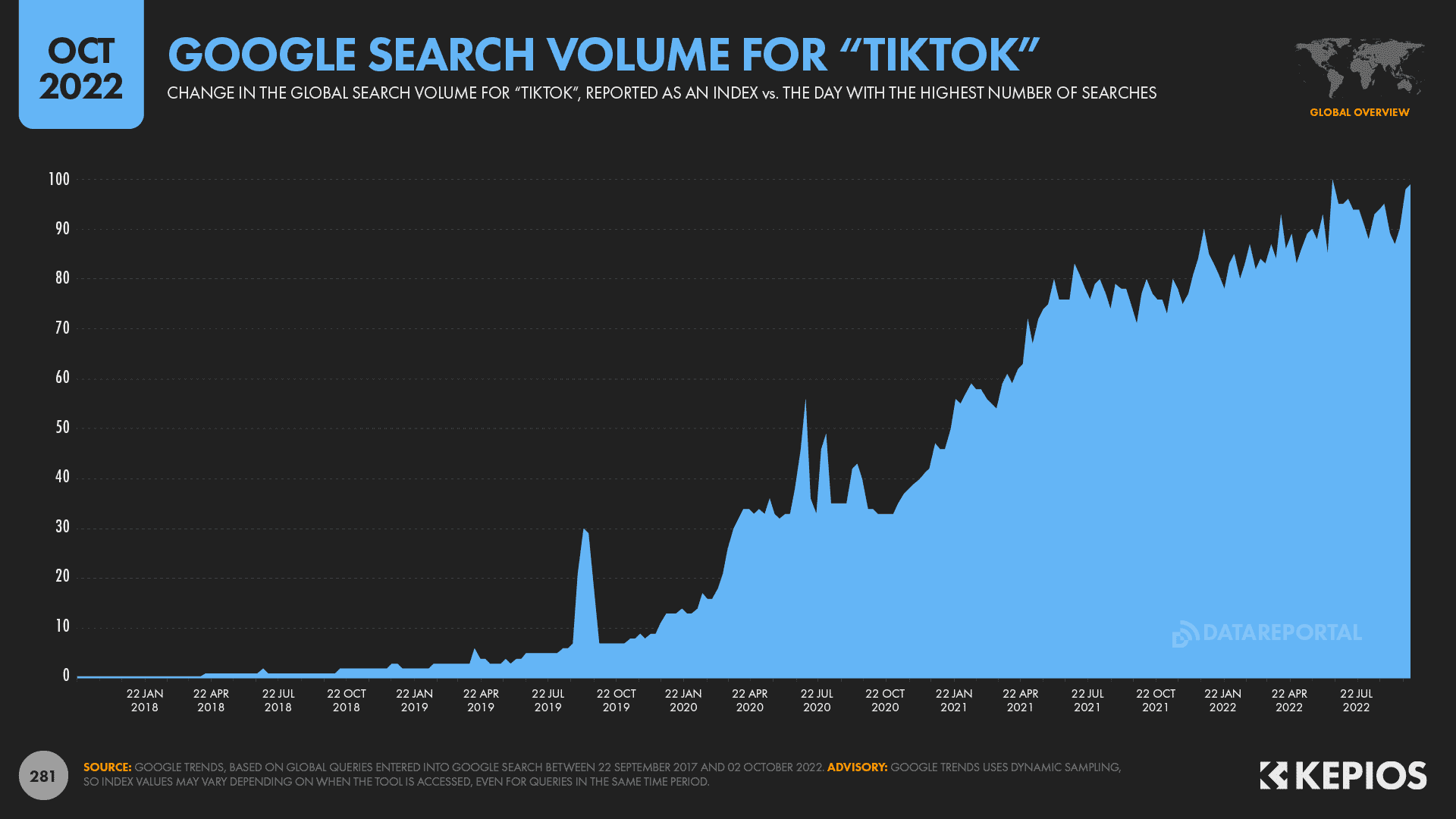 Across all queries entered into Google around the world between 01 July and 20 September 2022, TikTok ranked 25th by total search volume.