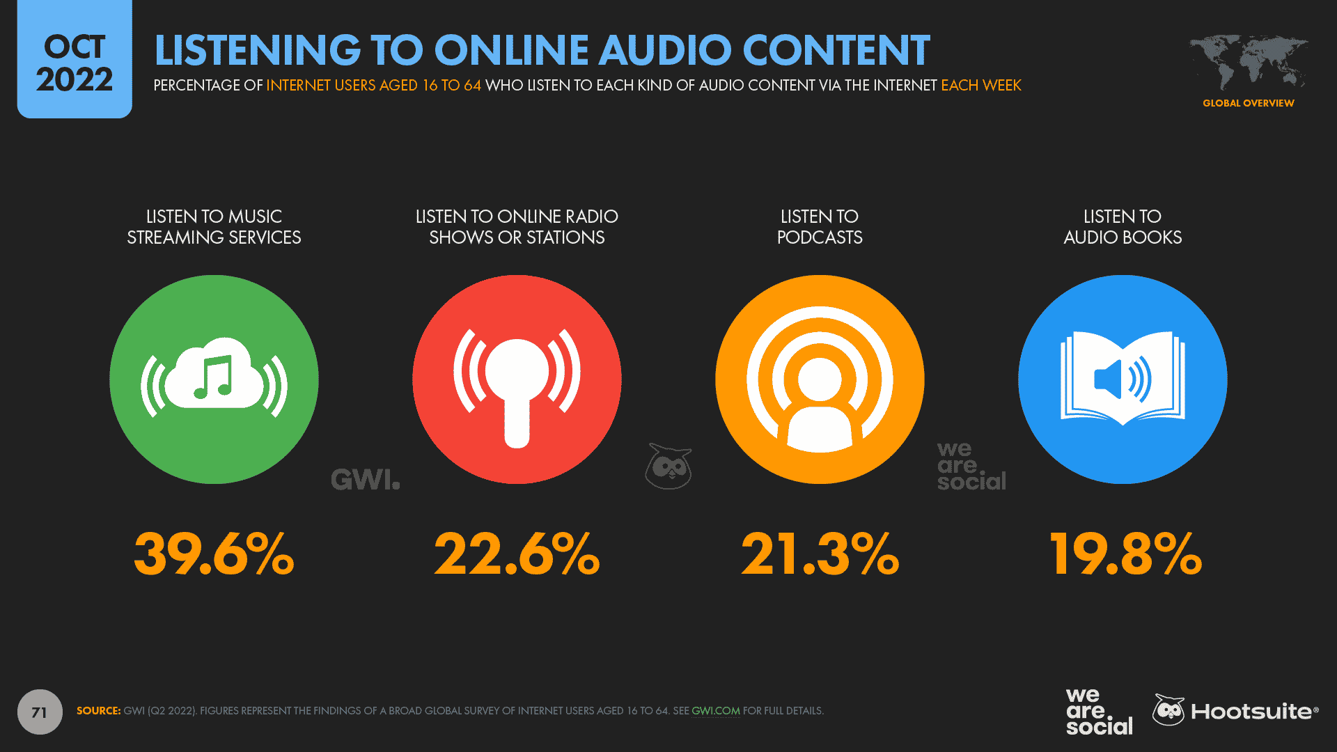 21.3% of internet users aged 16 to 64 now listen to podcasts each week, for an average of 61 minutes per day.