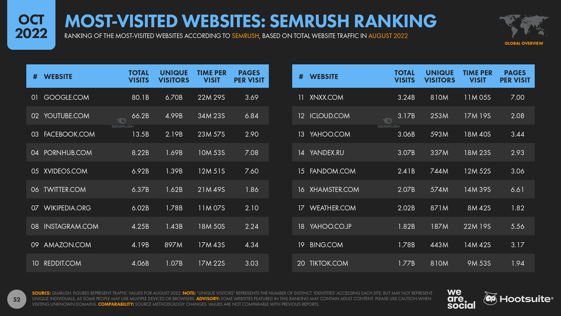 YouTube sees the highest number of unique visitors to its website, with Semrush reporting that a whopping 5 billion unique devices visited YouTube.com in August 2022.