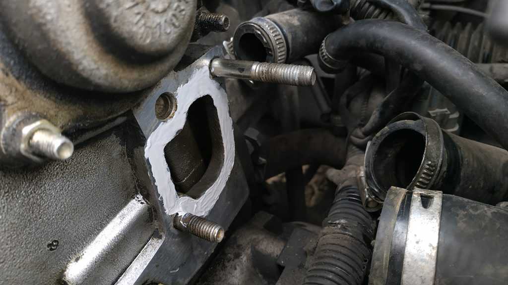Вместо старой прокладки, естественно, нужно установить новую, лучше выбрать паранитовую, а не бумажную. В моем случае будет лишь герметик, так как прокладку я не купил:( Поэтому я очистил поверхность термостата и поверхность крепления термостата на двигателе, нанес тонким слоем белый герметик -прокладку, подождал 20 минут (следуя инструкции) и установил термостат на место.