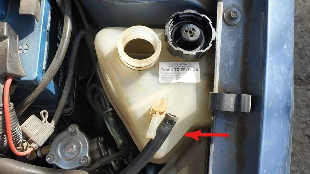 Далее нужно снять шланг перелива с расширительного бачка и чем-то закупорить отверстия на самом шланге и штуцере бачка.