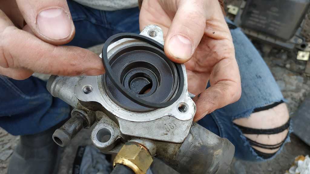 Снимите старый термостат и проверьте его состояние. Если он поврежден или неисправен, замените его на новый. Также необходимо заменить прокладку для обеспечения надежной герметизации.